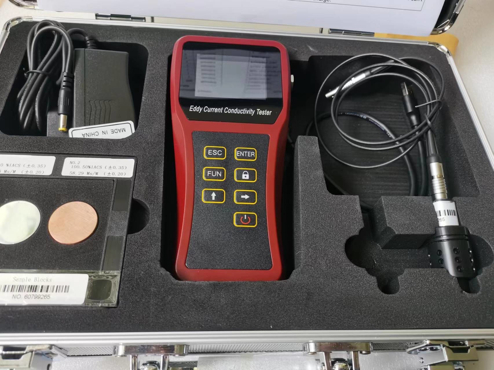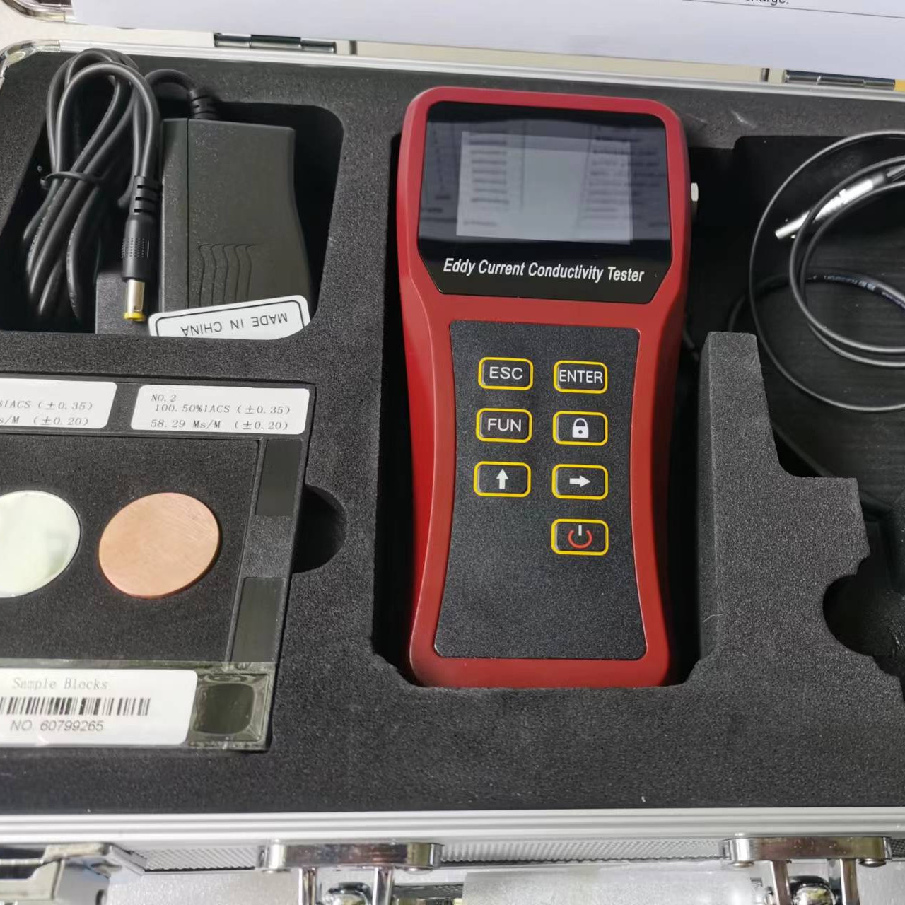 Hand-held eddy current conductivity tester for NF-metals with automatic normalization of the conductivity values to 20°C through temperature sensor.