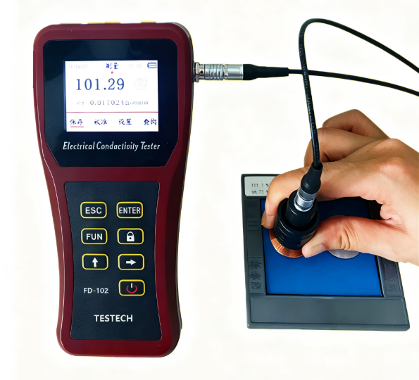 Hand-held eddy current conductivity tester for NF-metals with automatic normalization of the conductivity values to 20°C through temperature sensor.
