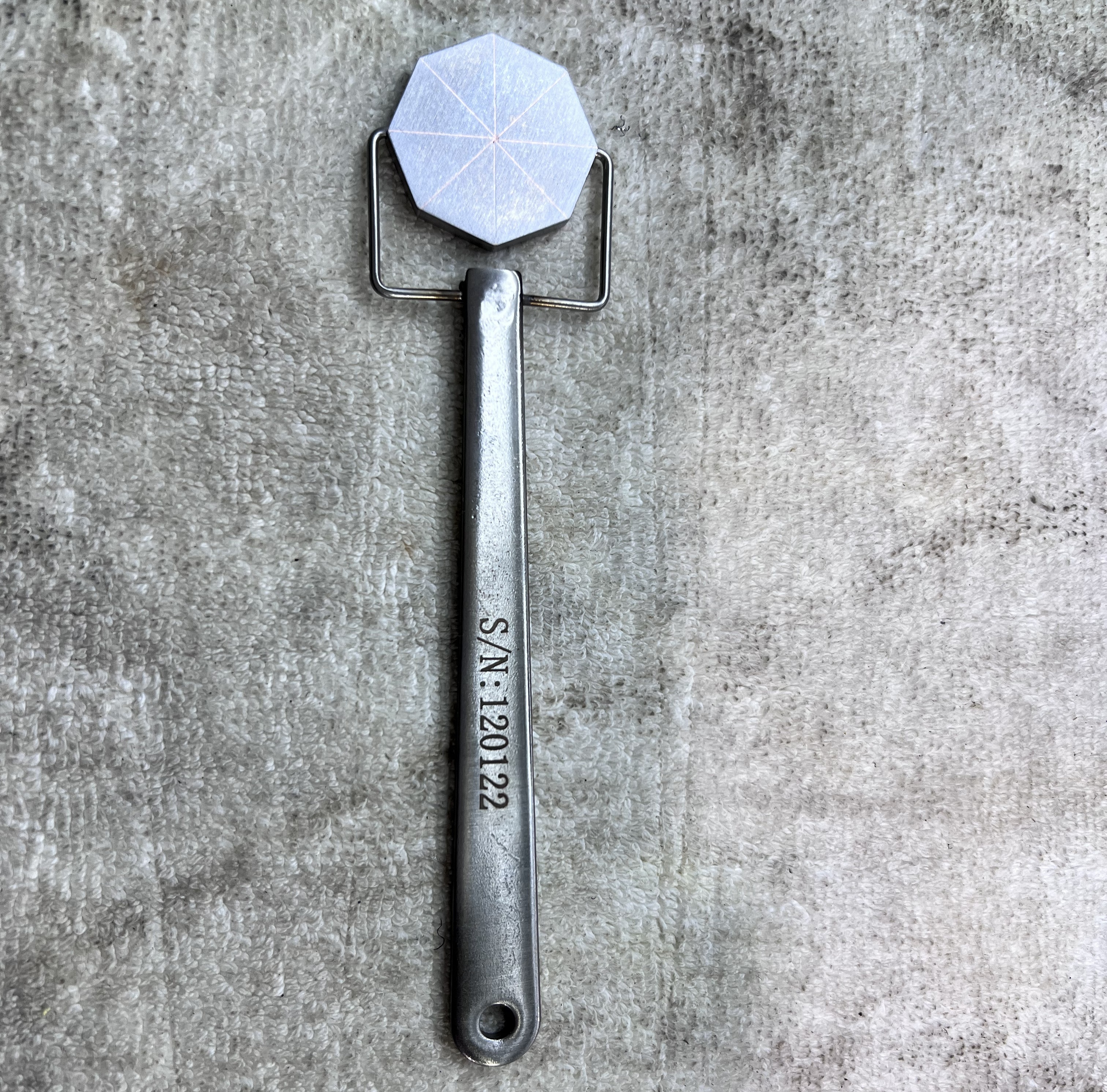 Eight linear discontinuities to provide indications in all directions Non-ferrous handle with pivot. INSTRUCTIONS Place the pie gauge as flat as possible on the test surface with the visible pie sections facing down. Magnetize the surface and apply magnetic particles. Indications will form along lines crossing the direction of the magnetic flux. Indications perpendicular to the magnetic flux will be stronger and more well defined than indications at an angle. No indications will form parallel to (in line with) the magnetic flux. Note: the pie gauge does not indicate magnetic field strength.